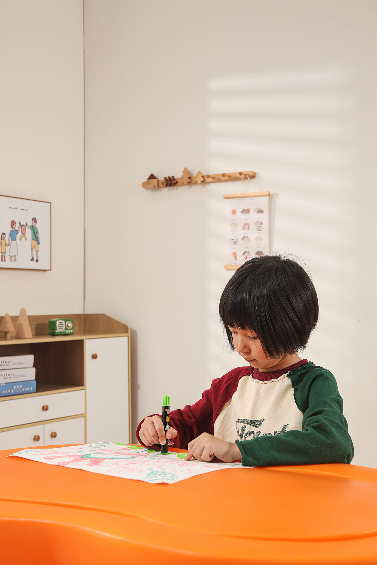 儲(chǔ)物柜的設(shè)計(jì)充分考慮了兒童的收納需求,柜內(nèi)分隔合理,便于孩子分類(lèi)存放玩具和學(xué)習(xí)用品。同時(shí),柜子采用滑動(dòng)門(mén)設(shè)計(jì),開(kāi)合順暢,安全可靠。